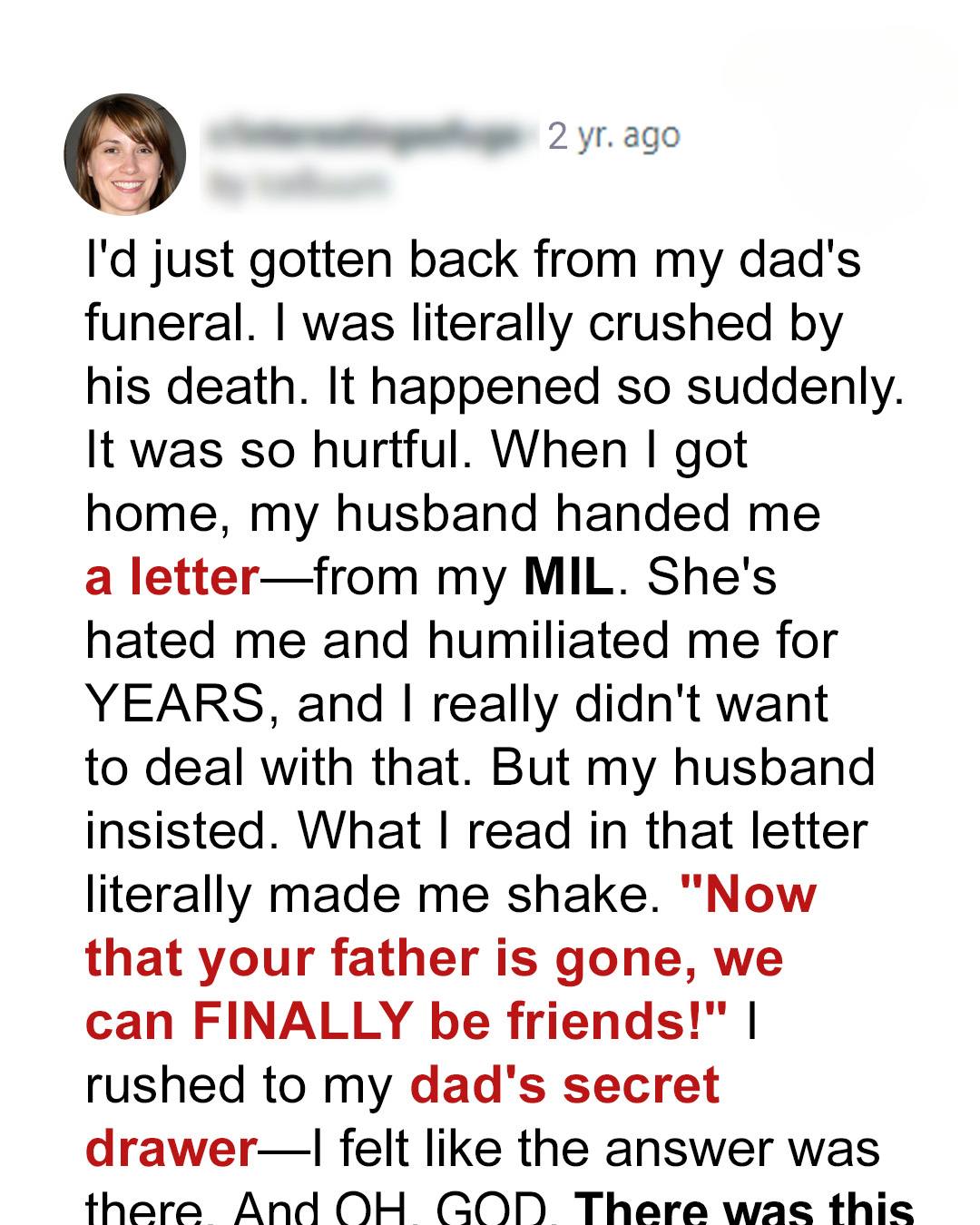 At the funeral, Carol surprised me with a rare apology and a strange question about the year 1981. The question lingered in my mind long after the guests left. The next morning, I found a letter from Carol, saying she wanted to start fresh now that my dad was gone. But why now? Her words felt hollow.
