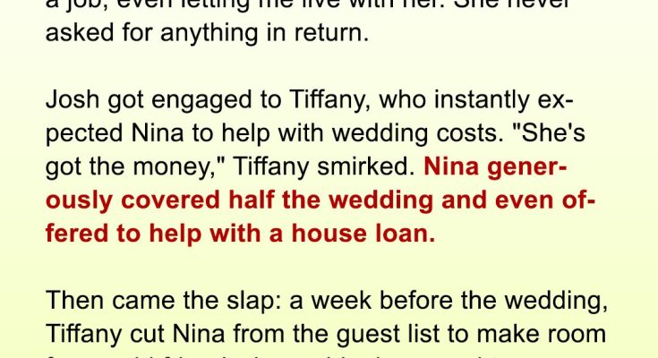 “Well, Nina’s basically like Josh’s second parent anyway,” she said, sipping wine. “She’s got the money. She can pitch in for the wedding.”