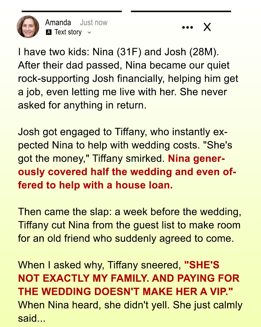 She gave a tight smile and said, “Well, Nina is not exactly… warm. Not like family. She’s always just kind of… there. Amanda’s fun. She fits our vibe.”
