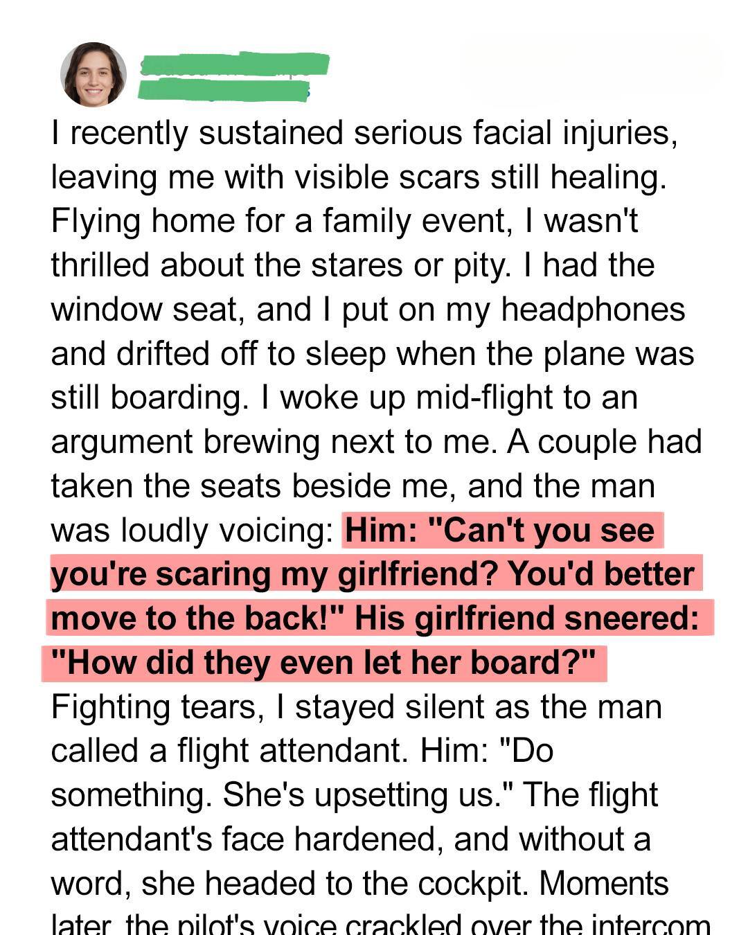 When Carla boarded the plane, the healing scar across her face felt like an unspoken barrier between her and the world. It was the aftermath of a recent car accident—a jagged line stretching from her brow down to her jaw, still red and raw. Despite her efforts to stay calm and avoid attention, the couple seated beside her couldn’t hide their disgust. They openly demanded she cover her face or be moved, claiming her scars were “scaring” them. The cold stares and whispered judgments she had endured for weeks now turned into a hostile confrontation at 30,000 feet.