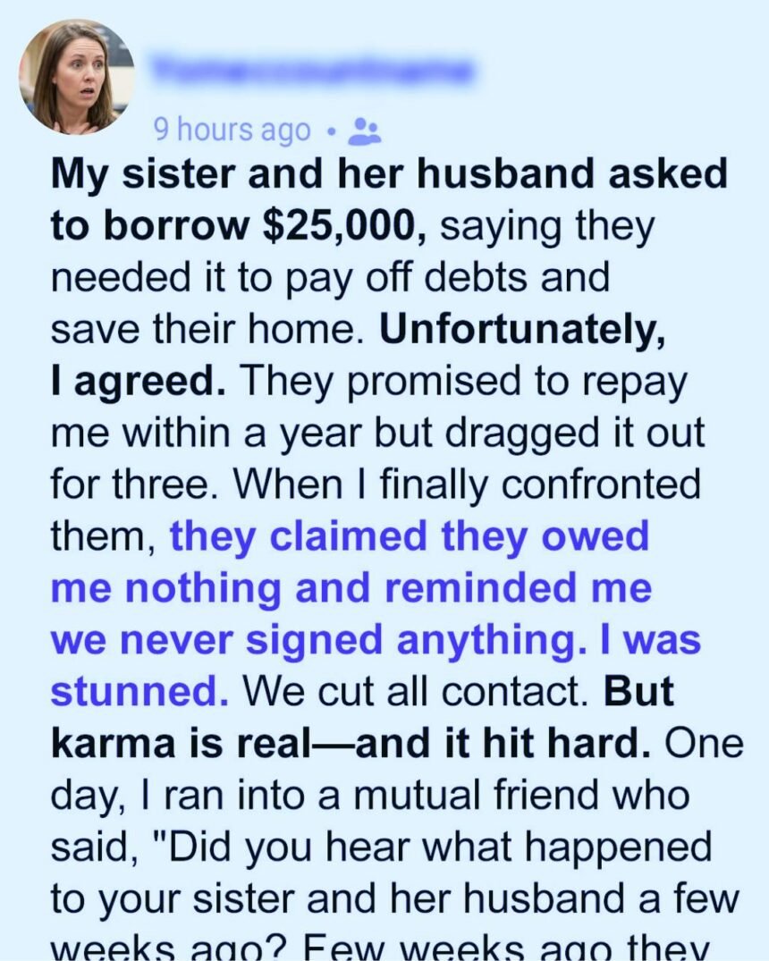 My sister and her husband asked to borrow $25,000, insisting they needed it to pay off debts and save their home. I hesitated—money and family rarely mix—but they sounded desperate. My sister cried, telling me they’d be homeless without help.