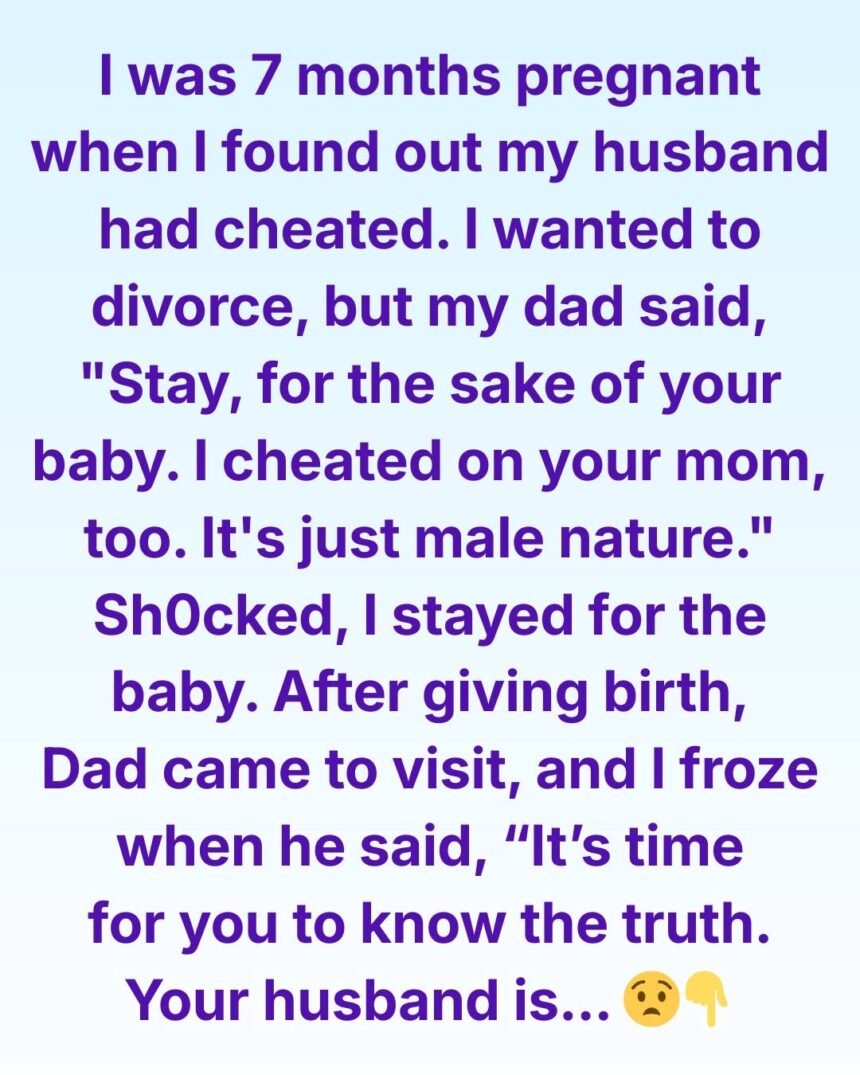 He let out a long, tired sigh. “I never cheated on your mom. I lied because I didn’t want you to go through all that stress while you were pregnant.