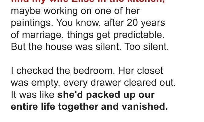 Twenty years of marriage taught me the rhythm of life—the way the coffee maker gurgles at 6:30 a.m., the soft click of the front door when I leave for work, and the gentle hum of Elise’s voice as she talks about her day when I return home. But that evening, something was off. Walking through our front door, I was met with silence.