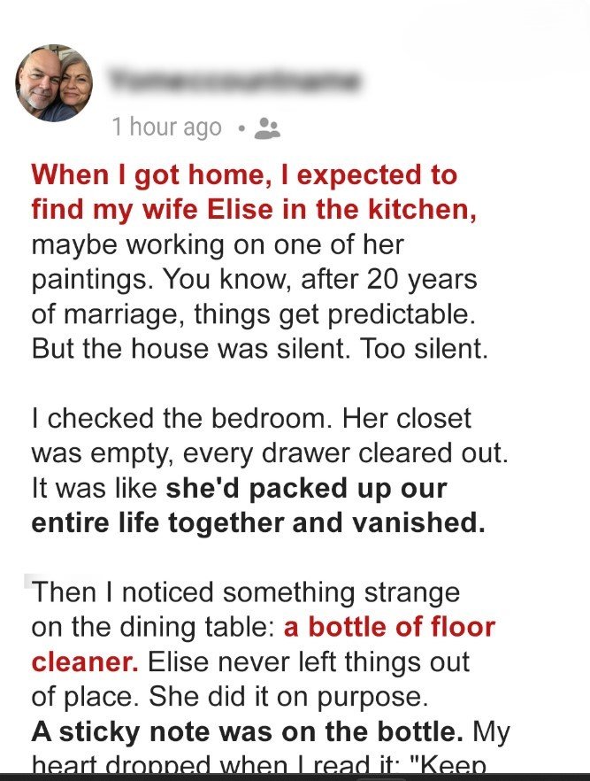 I came home expecting my wife’s warm smile and hearty meal. Instead, I found a bottle of floor cleaner and a note that pierced through two decades of my life. She ended our 20-year marriage overnight, but the real shock came when she explained why.