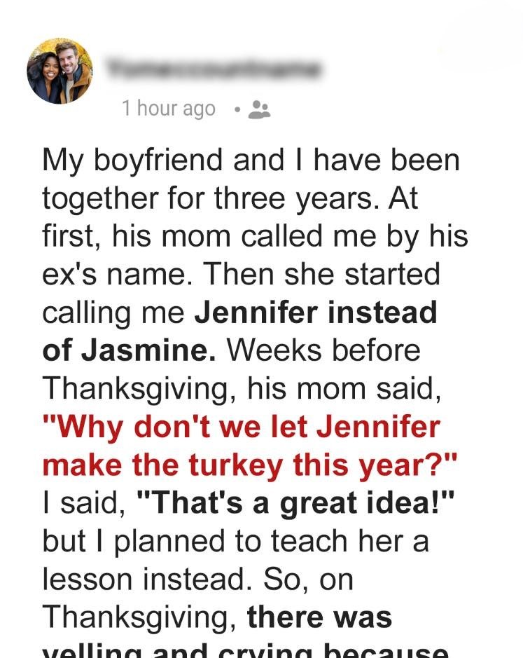 During a pre-Thanksgiving gatheringA few weeks before Thanksgiving, the lady’s sweetheart’s mom mockingly recommended she cook the turkey, indeed utilizing some unacceptable name.