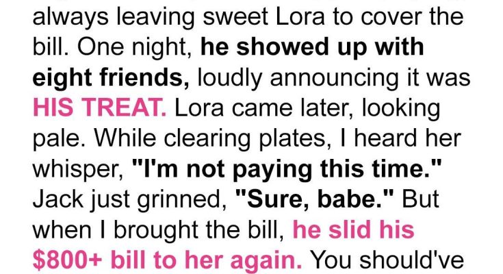 Jack sputtered and argued, his face turning from red to purple. He demanded to speak to the manager, but I politely informed him that he was busy. In the end, with no Lora to share the financial burden and his “friends” long gone, Jack was forced to pay for the entire meal, his grand night out with the guys dissolving into a bitter aftertaste of loneliness and a hefty bill.
