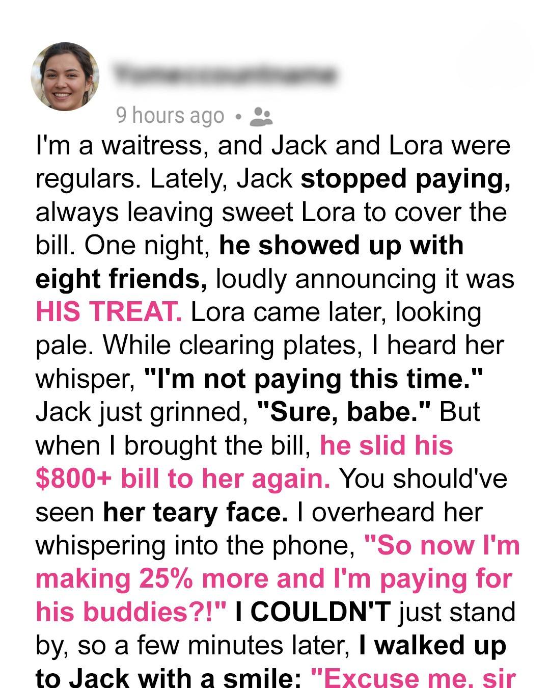 Eight hundred dollars plus. That’s what Jack’s “boys’ night out” bill came to, and he expected his wife, Lora, to foot it. Waitress Melanie, witnessing Lora’s despair, concocted a bold move to ensure Jack’s night didn’t end as he planned.