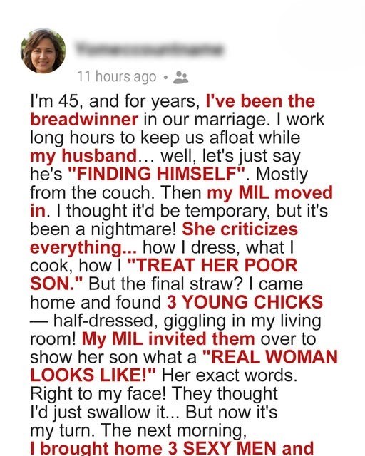 My husband stood frozen, his face a mask of bewilderment that quickly shifted to something I couldn’t quite decipher. Fear? Shame? I couldn’t tell. My MIL, however, was beaming. Her cold eyes sparkled with malicious glee as she ushered them inside, talking animatedly about their “potential,” their “pure hearts,” their “readiness for a good man.”