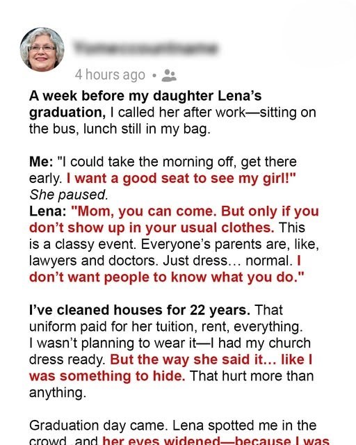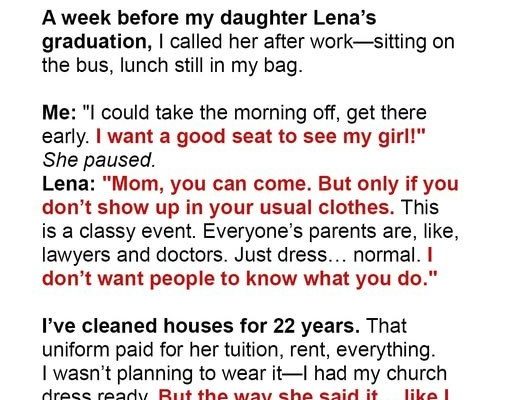 She was ashamed of me.My heart ached. I pictured her, radiant and composed, ready to stride across that stage, a future shimmering before her. I’d worked my fingers raw, stretched every penny, sacrificed so much to get her there. And now, my reward was a quiet humiliation.