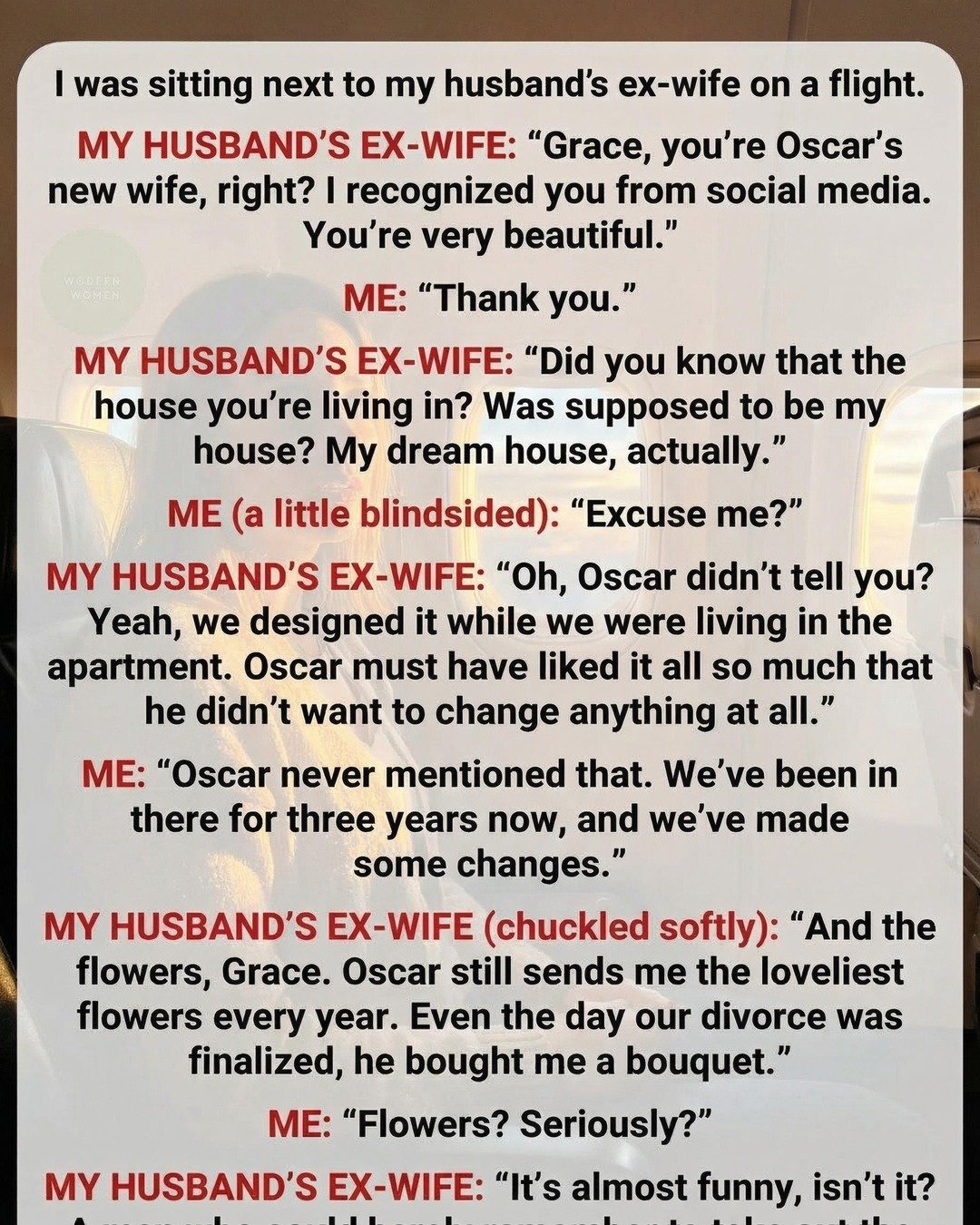 I was sitting next to my husband’s ex-wife on a flight. At first, it felt like some cosmic prank—two strangers assigned adjacent seats, only for the universe to reveal we weren’t strangers at all. She introduced herself with a warm smile, the kind that suggested she already knew more about me than I was comfortable with.