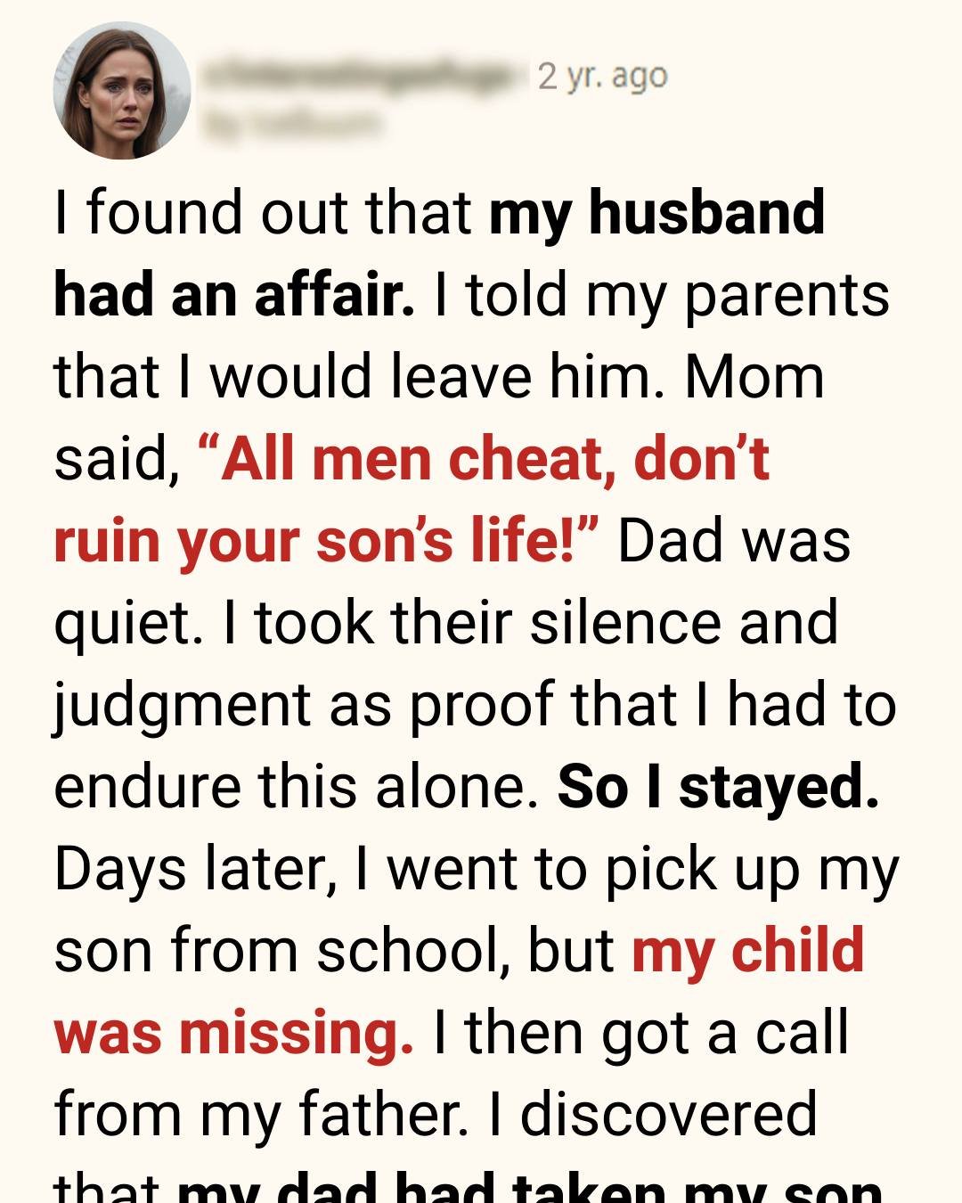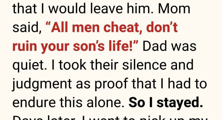 I was tired, hollow, and desperate for someone—anyone—to say I was doing the right thing. Instead, my mother sighed, put down her teacup, and said the words that cut deeper than my husband’s betrayal: “All men cheat. Don’t ruin your son’s life over something small.”