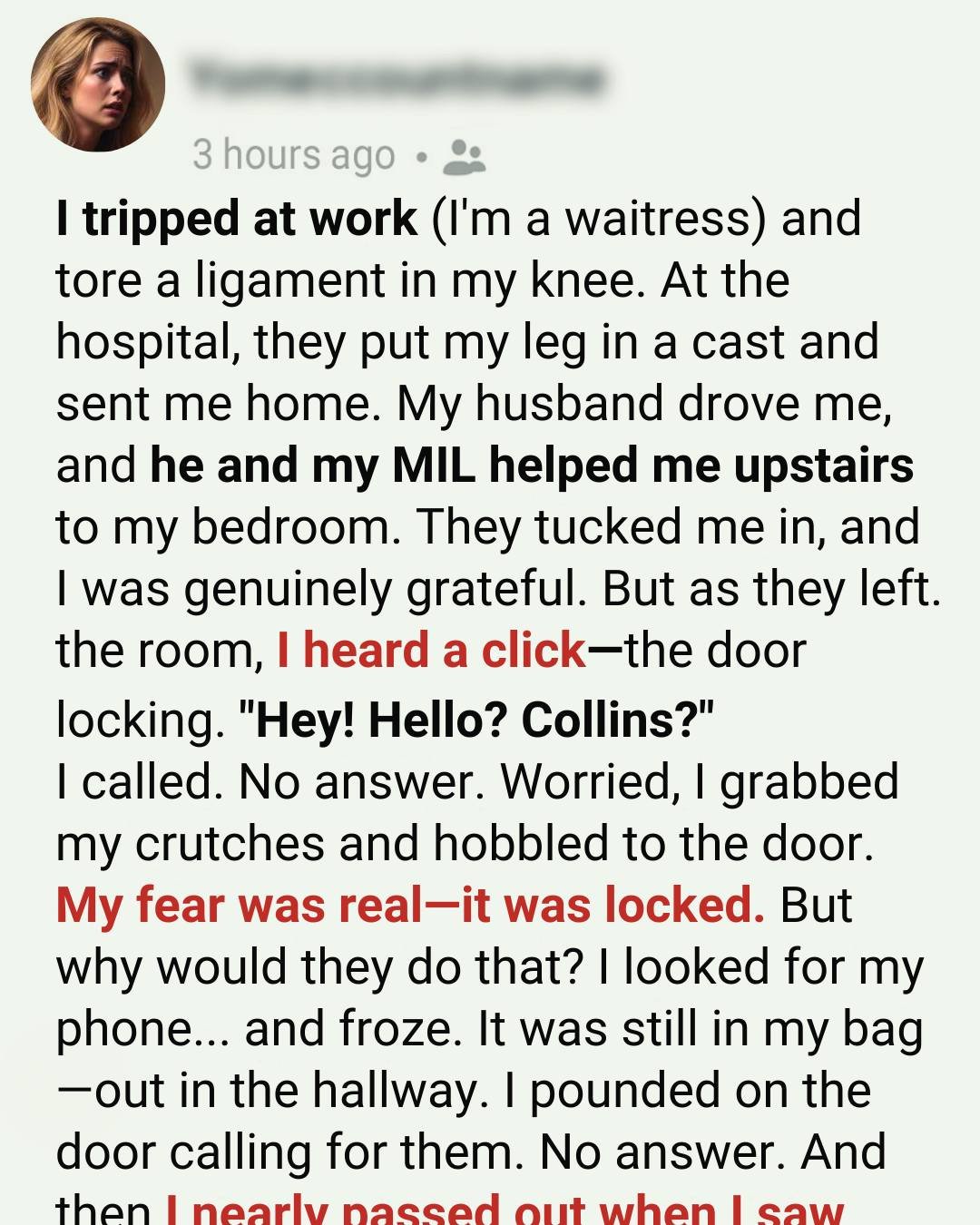 I tripped at work—I’m a waitress—and felt something snap in my knee before I even hit the floor. The doctor said it was a torn ligament, wrapped my leg in a cast, and sent me home with strict instructions to rest. My husband, Collins, drove me back.