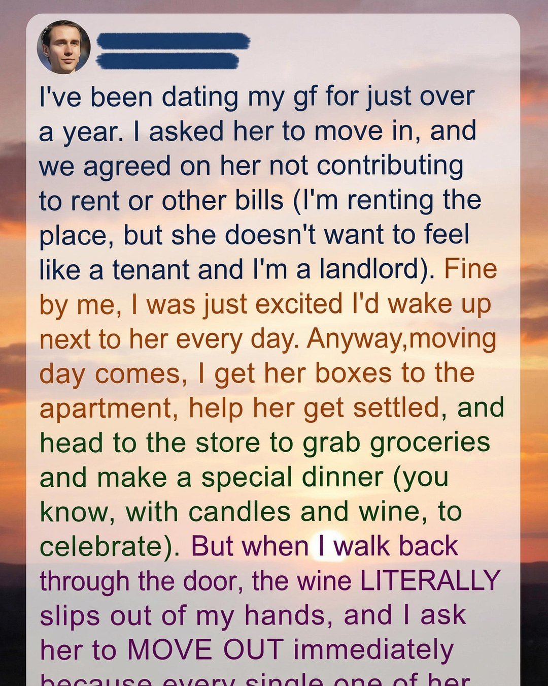 Moving day comes, I get her boxes into the apartment, help her settle in, and head to the store to grab groceries so I can prepare a special dinner—candles, music, the whole thing. But when I walk back through the door, the wine literally slips out of my hands, and I ask her to move out immediately because every single one of her boxes is completely empty. Instead of unpacking her belongings, she had used the time to rearrange the entire apartment, replacing my furniture, my decorations, and even the layout I had lived with for years.