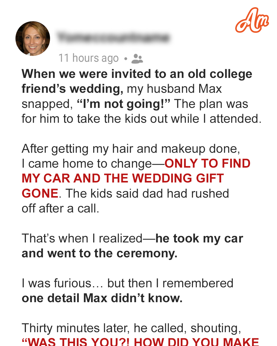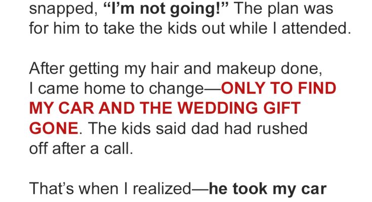 I didn’t know whether to scream or cry. He’d taken MY CAR, ditched OUR KIDS, and gone to the wedding he’d REFUSED to attend. And he hadn’t even bothered to text me.