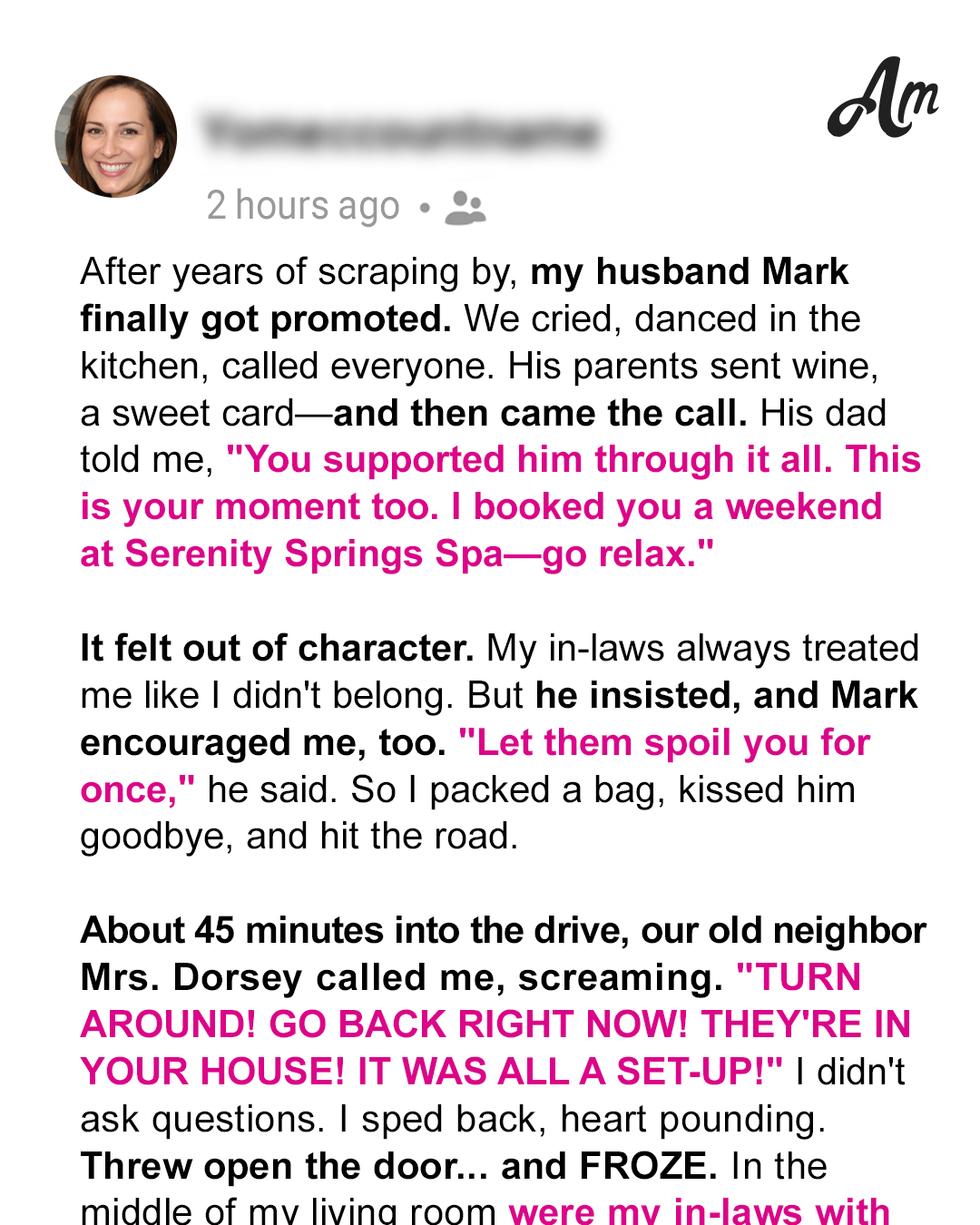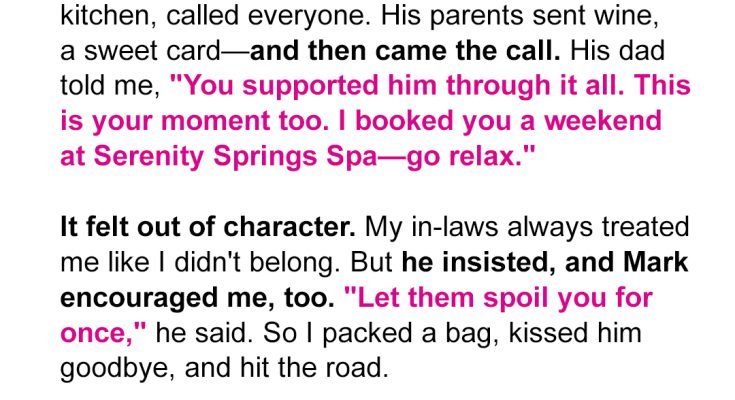 When my father-in-law offered to send me on a luxury spa weekend, I thought maybe my in-laws were finally trying to include me. I was halfway to the resort, driving in peace, when my elderly neighbor called, screaming for me to turn back. What I saw when I got home shook me to my core.