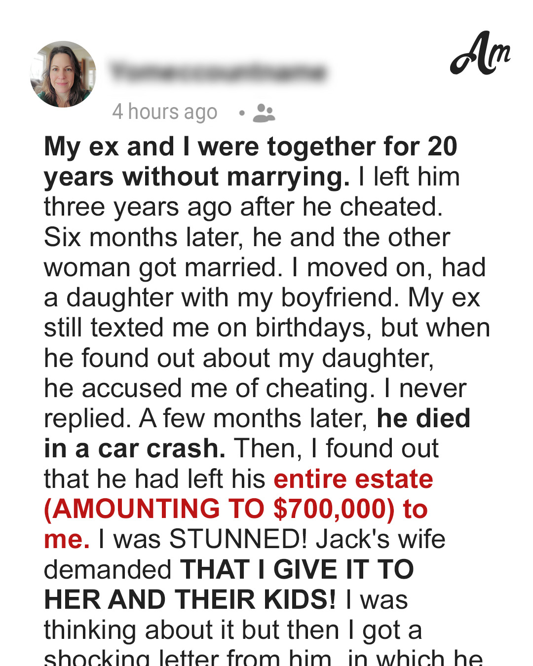 As I ponder these questions, I find myself seeking not just validation but understanding. Was keeping the inheritance the right decision, or should I have considered a different path, one that might have eased the grief and anger of those Jack left in his wake? In navigating this complex web of emotions and obligations, I’m left wondering if the path I chose was truly the best, not just for me and my family, but for the memory of a man whose final act was to give me everything.