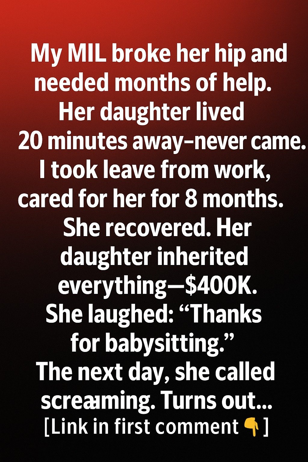 My MIL broke her hip and needed months of help. Her daughter lived only twenty minutes away but always had a reason she couldn’t come—meetings, errands, or simply “bad timing.”