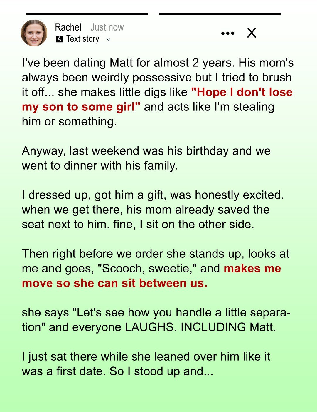 But I didn’t understand just how close—until that one night at dinner, when I found myself sliding quietly down a restaurant bench while his mother sat next to him, grinning like she had just won a prize. That night, a simple dinner reservation turned into a clear message: I was never the main person in his life. Matt and I had been dating for almost two years.
