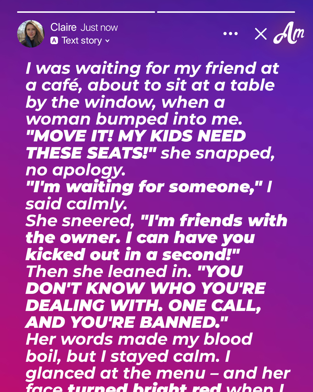 Tensions flare when Claire’s quiet café morning is disrupted by an entitled mother demanding her seat. As the woman’s rude insistence escalates to physical aggression, Claire stays calm, setting the stage for a clever comeback.