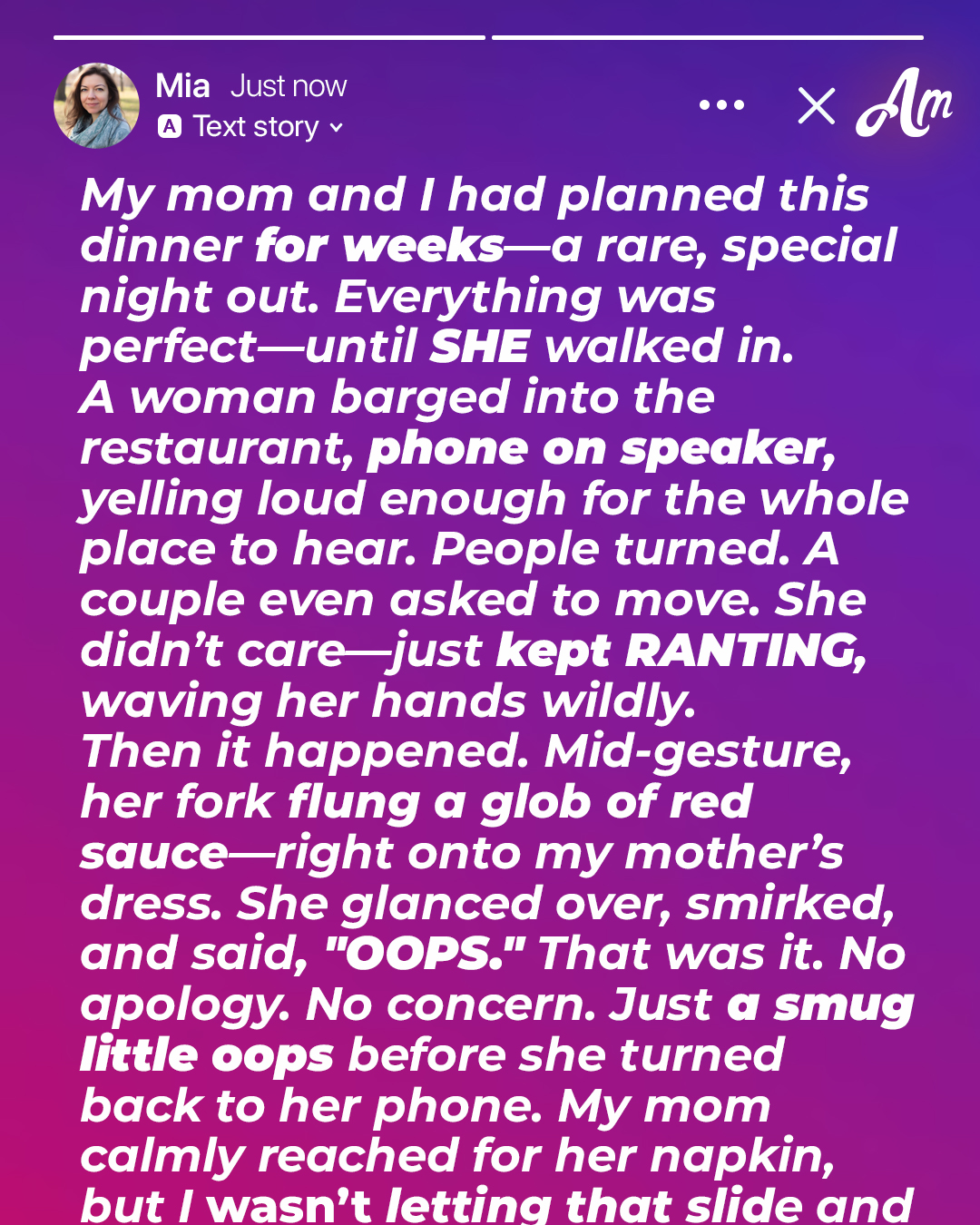 My mother and I were enjoying a rare, elegant dinner when a loud woman barged in, disrupting the entire restaurant. Just as we tried to ignore her, she flung food across the table, splattering sauce onto my mother’s dress. I wasn’t about to let that slide.