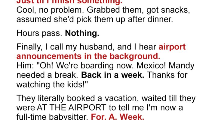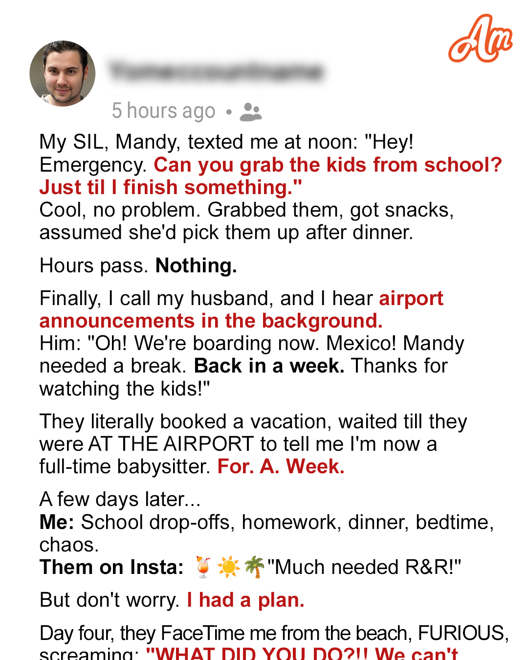 When Mandy asked me to watch her kids for a few hours, I didn’t think twice. But hours turned into a shocking phone call: my husband and his sister were already boarding a flight to Mexico. No discussion. No warning. Just me, two kids, and a week-long betrayal I never agreed to.