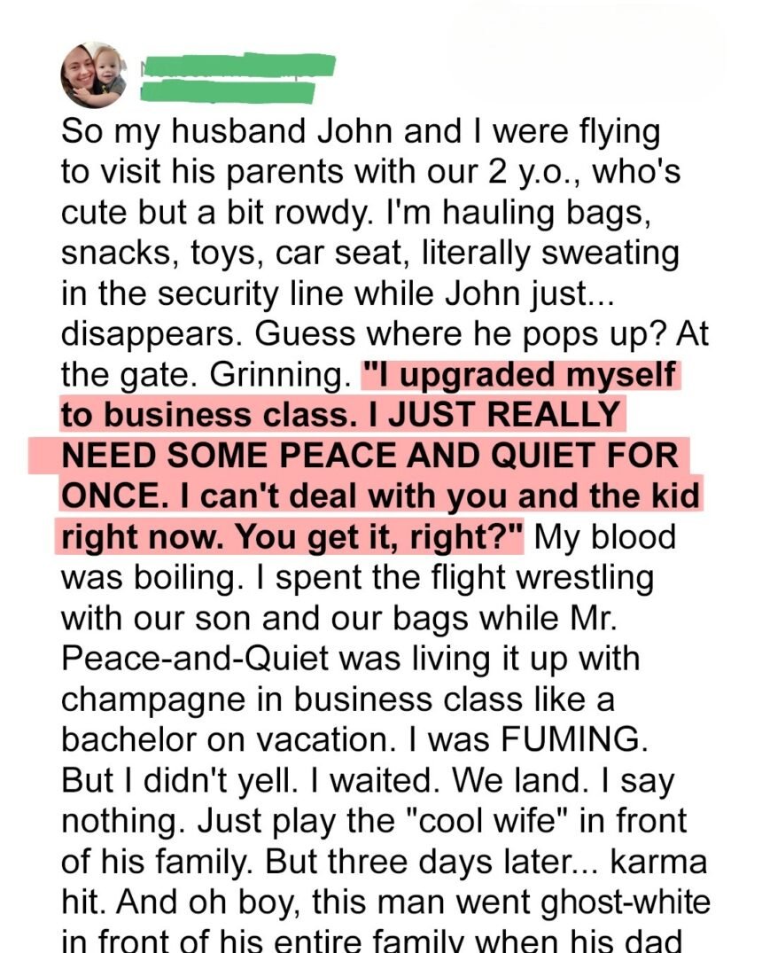 When Claire, John, and their son, Ethan, board a flight to John’s parents, John mysteriously disappears to Business Class, leaving Claire to tackle the flight with the baby alone. But when they get to their destination, Claire’s father-in-law teaches John a lesson that he won’t forget. About a week ago, my father-in-law really showed my husband that despite being married and having a son, he still had a lot to learn.
