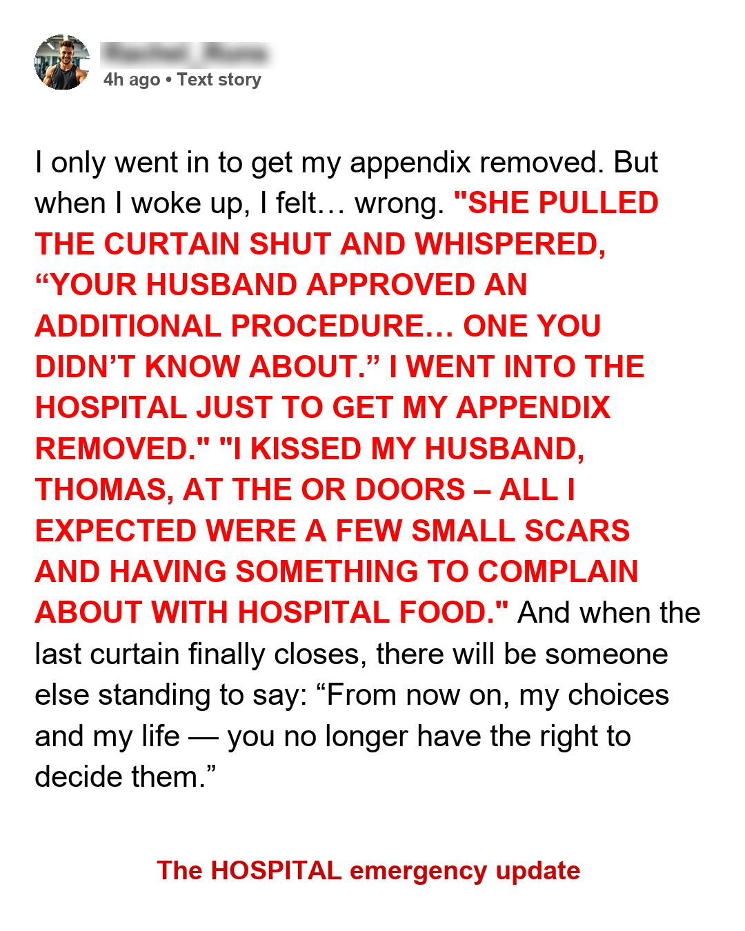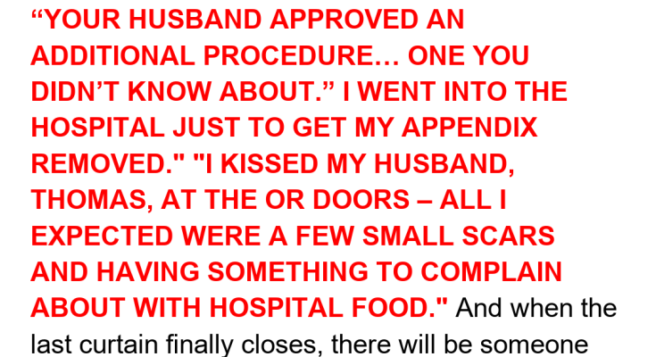 I only went in to get my appendix removed. But when I woke up, I felt… wrong. The nurse helping me change said softly, “I’m so sorry. I didn’t know he didn’t tell you.” “Tell me what?” I asked. She pulled the curtain shut and whispered, “your husband approved an additional procedure… one you didn’t know about.” I went into the hospital just to get my appendix removed. I kissed my husband, Thomas, at the OR doors – all I expected were a few small scars and having something to complain about with hospital food. But when I woke up, the discomfort I felt was in a place that didn’t match the surgery I remembered. And the young nurse kept glancing at the door before closing the curtain, whispering words that even now make my chest tighten.