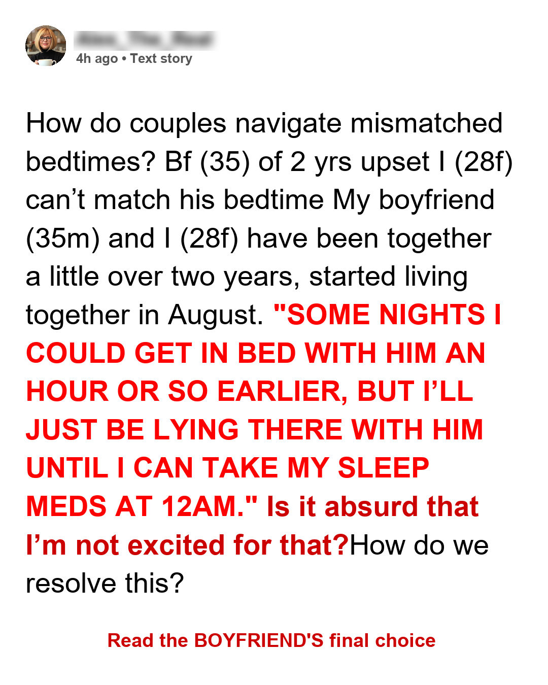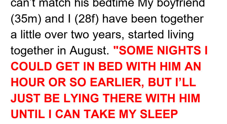 How do couples navigate mismatched bedtimes? Bf (35) of 2 yrs upset I (28f) can’t match his bedtime My boyfriend (35m) and I (28f) have been together a little over two years, started living together in August. We’ve had a recurring conflict about bedtime. He wants us both in bed by 10pm because he needs 9–10 hours of sleep. My sleep condition limits me to about six hours of sleep exactly. If I go to bed at 10, I’m up at 4am stuck tiptoeing around, unable to leave the house (I’m disabled, don’t drive) or start work without derailing my whole day. Plus, I need some decompression time at night to reset my brain—reading, watching something, just coming down from the day. So realistically, midnight is the earliest that actually works for me.