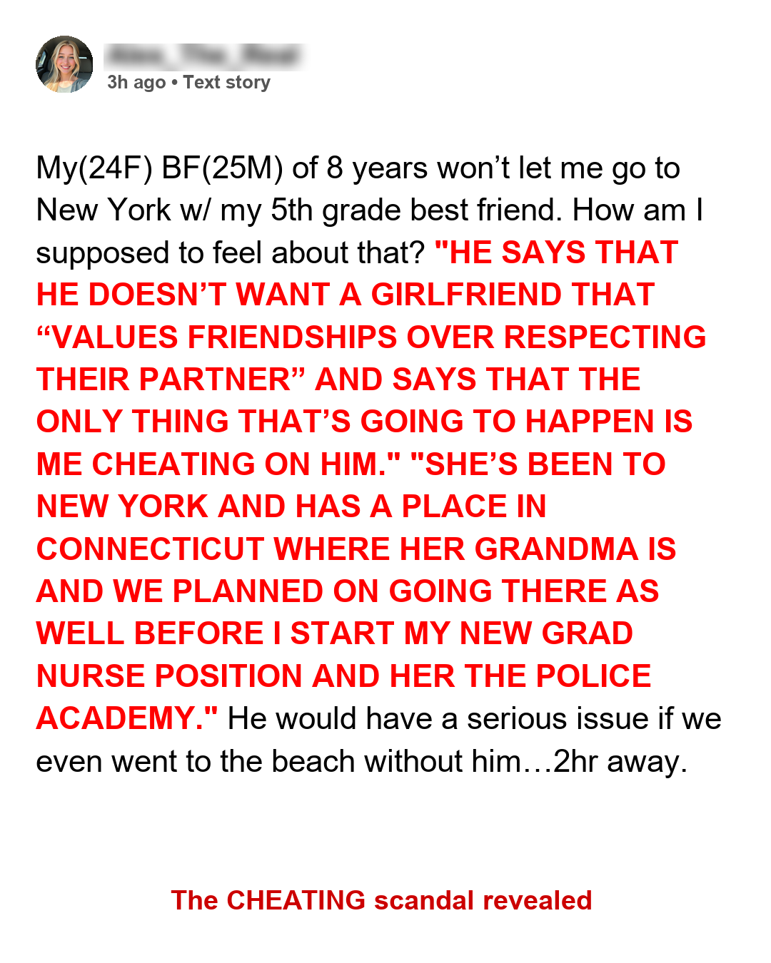 My(24F) BF(25M) of 8 years won’t let me go to New York w my 5th grade best friend. How am I supposed to feel about that