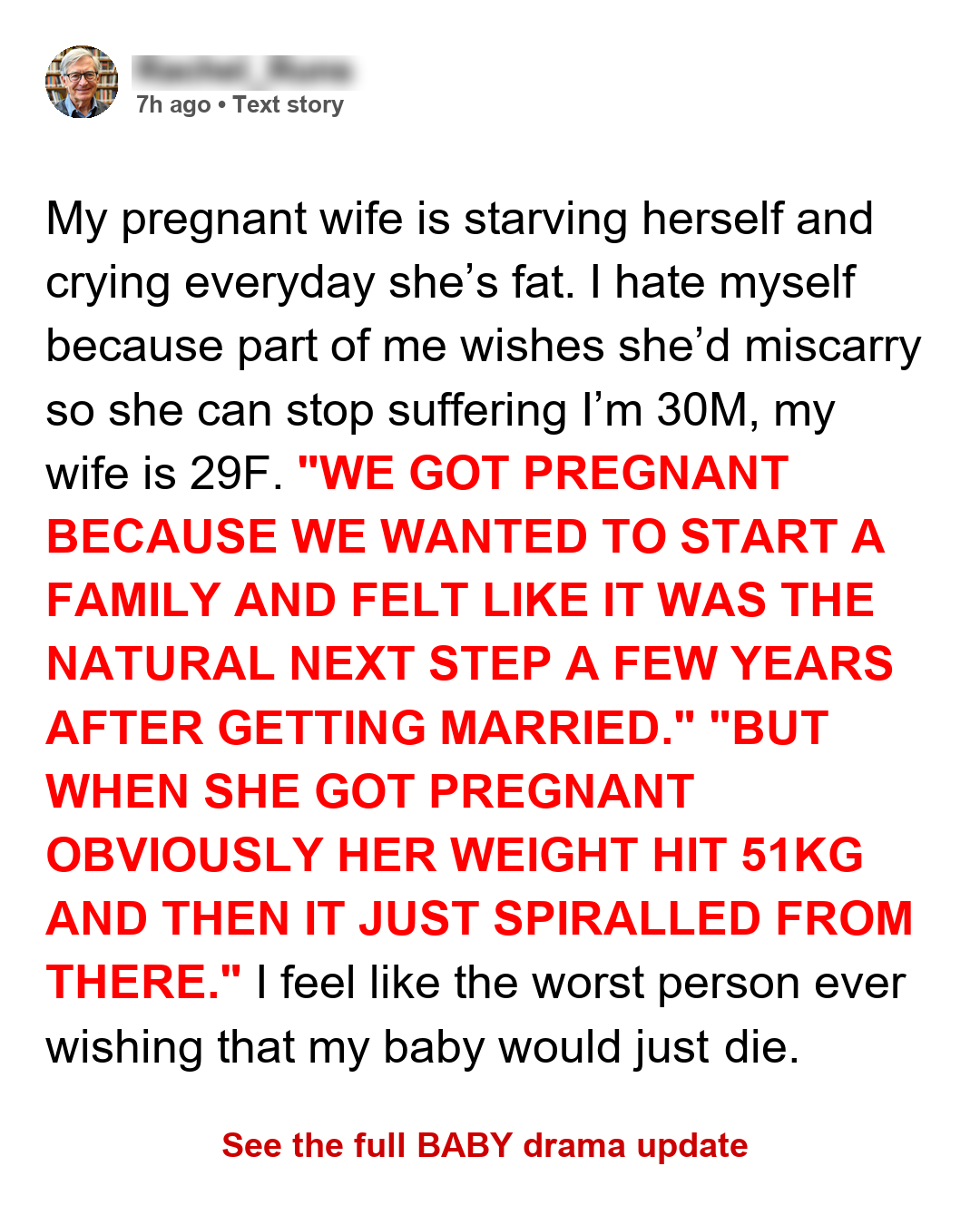 My pregnant wife is starving herself and crying everyday she’s fat. I hate myself because part of me wishes she’d miscarry so she can stop suffering I’m 30M, my wife is 29F. She’s the love of my life and I adore her more than anything. We have been together since we were 16 and 17. She’s about 5-6 months pregnant now. She’s always had a disordered relationship with food but it was come and go. We come from a country with mostly East Asians so being at her current height and weight is basically like 80% of all the women here. She’s always been 158cm (5’2.5) and 49kg (108lbs) ever since we started dating, and when she’s at that weight she’s okay, she doesn’t obsess about food or her body. But whenever she hits 51kg (112.4lbs), every single time, she starts controlling her portions, skipping meals on our dates and just ordering 0-cal drinks. It’s like that specific number triggers her.