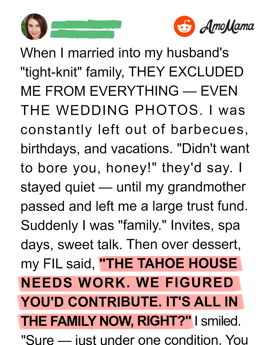 I tilted my head and gave her my best sugar-sweet smile. “Exactly. And now that you know what’s in my bank account, suddenly I’m family. How touching.”