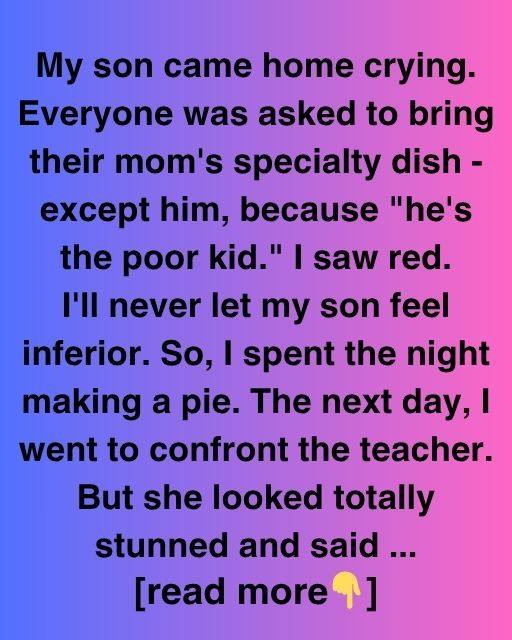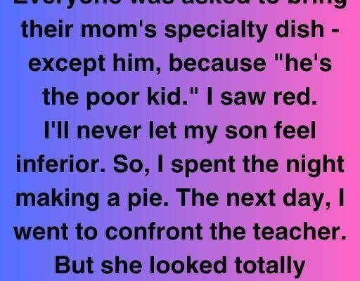 Our son came home crying. All but him were requested to bring their mom’s specialty dish because “he’s the poor kid.” I saw red. I’ll never degrade my son. So I made pie all night. The next day, I confronted the teacher. She looked shocked and continued, “I never said anything like that. I never excluded anyone, including your son.”
