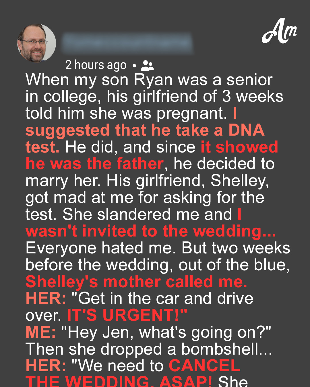 And then she dropped a bombshell on me. Her words were rushed, urgent, and they carried a weight that I couldn’t immediately understand. “We need to cancel the wedding,” she said, a statement so bold and out of the blue that it momentarily took my breath away. “I found out Shelly really was lying all this time. I can’t allow your son’s life to be ruined like this.”