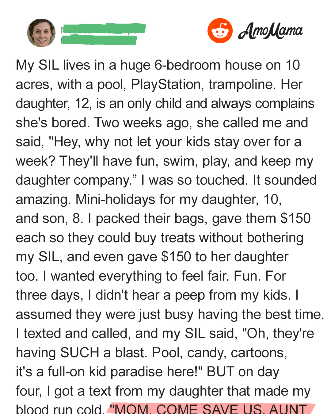 When my sister-in-law offered to host my kids at her mansion (with a pool, games, and endless treats), I thought it was a dream come true. But after days of silence and a chilling text from my daughter, I drove over unannounced… and what I saw in her backyard left me absolutely shaken.