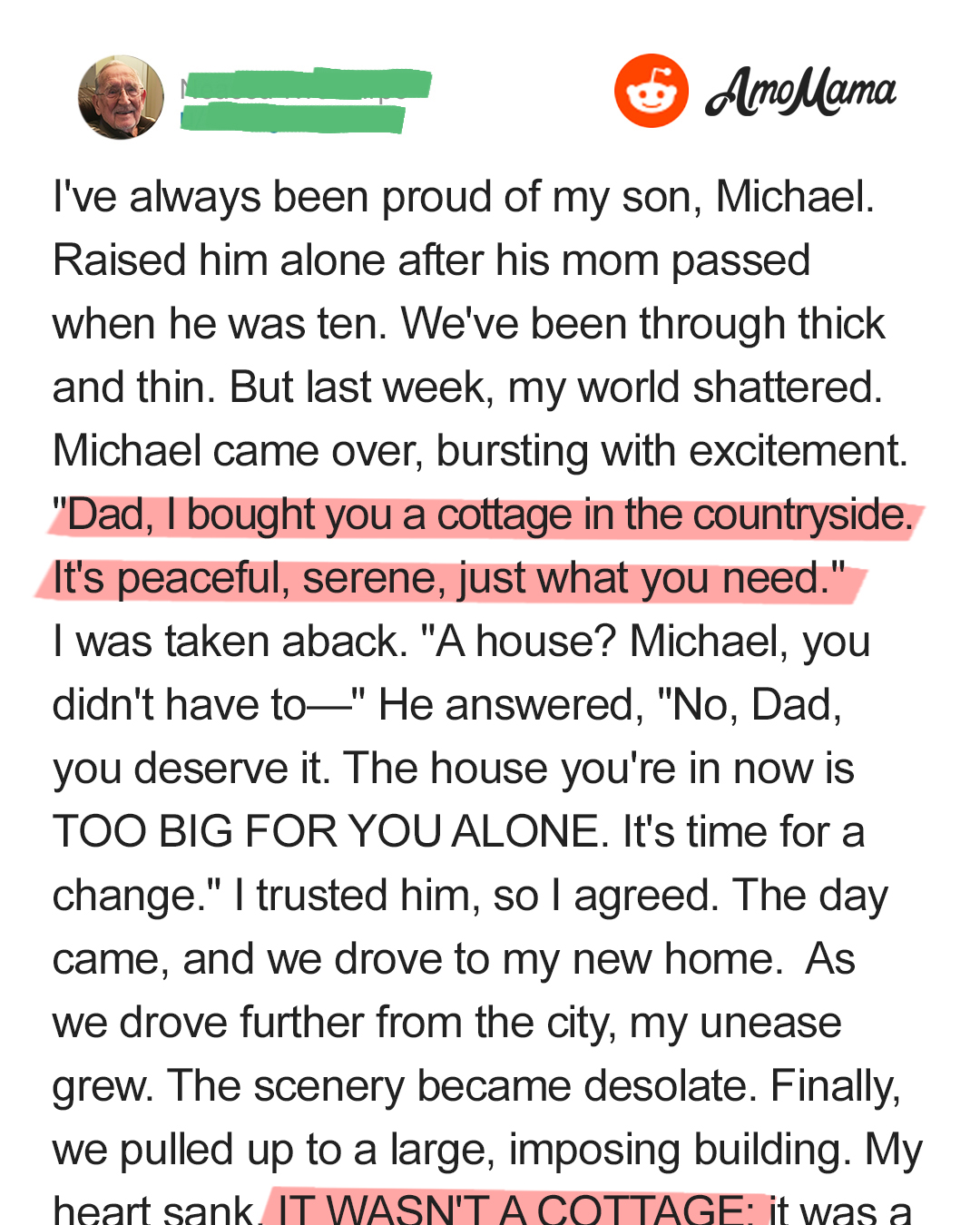 “Dad,” he said, but couldn’t even look me in the eyes. “I’m sorry. I know I said it was a cottage, but… this is better for you. You’ll be taken care of here.”