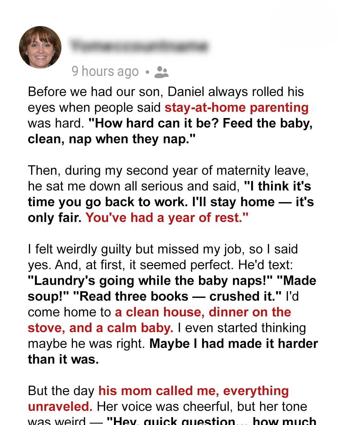 And there it was. Not messages with another woman. Worse. A picture. A bright, colourful birthday cake with five candles. His arm was around a beautiful woman I didn’t know, and between them, a little girl, maybe five or six, beaming up at him. The caption, from the woman’s account, simple and devastating: “Best dad ever. So lucky to have you.” MY GOD. A whole other life. He wasn’t tired because of our life. He was tired from living TWO of them. And “nap when they nap”? He was probably “napping” in a different bed, with a different family, where he wasn’t the tired, burdened father, but someone else’s hero.