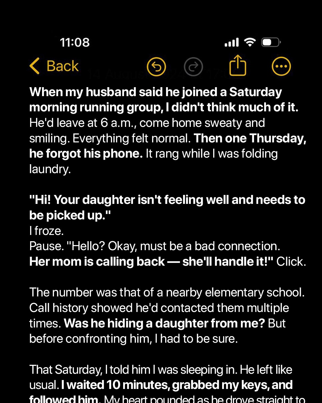 When my husband said he joined a Saturday morning running group, I didn’t think much of it. He’d leave at 6 a.m., come home sweaty and smiling. Everything felt normal. More than normal, actually. He seemed happier, lighter, and I loved seeing him so invigorated. I remember thinking how good it was for him, for us. Then one Thursday, he forgot his phone. It rang while I was folding laundry, a strange, unfamiliar number flashing across the screen. I hesitated. It wasn’t like me to snoop, but something felt… off. The call ended, then started again immediately. My chest tightened. I answered, my voice a little shaky.