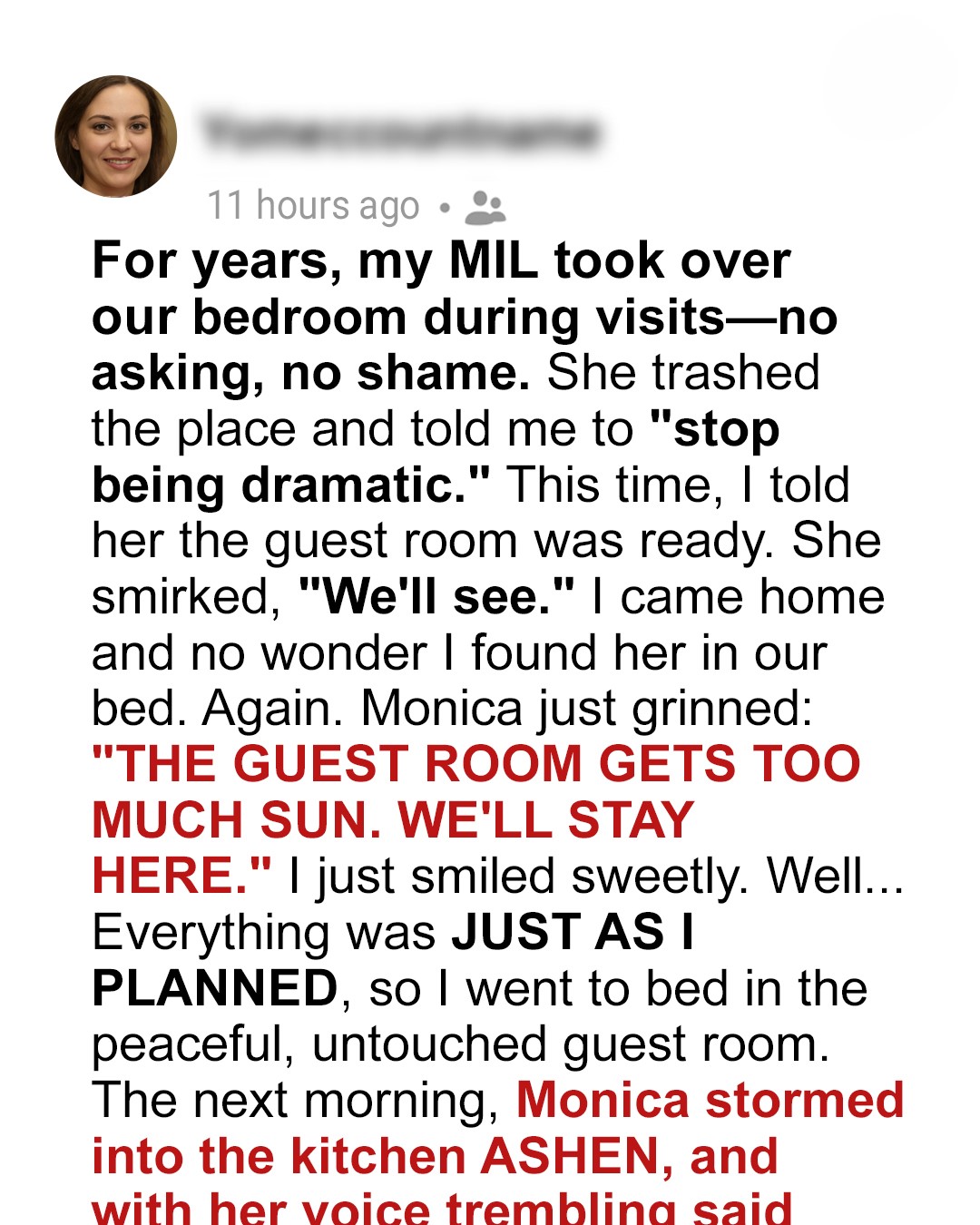 For years, my MIL took over our bedroom during visits—no asking, no shame. She’d walk in, dump her bags, and claim it as her own, leaving a trail of clothes, empty tea cups, and a pervasive smell of stale perfume. She trashed the place, often leaving my things broken or misplaced, and when I’d gently protest, she’d just wave a dismissive hand, telling me to “stop being dramatic.” But this time, something snapped inside me. I just couldn’t take it anymore. She arrived last Tuesday, for what was supposed to be a week-long stay. Two days in, and our sanctuary was a disaster zone. My dresser drawers were pulled out, her items mingled with mine, a half-eaten sandwich sat on my nightstand, and the bathroom looked like a cosmetic bomb had gone off. Every fiber of my being screamed for control, for respect, for my own home back. I kept telling myself, just breathe, just wait it out, but the knot in my stomach tightened with every hour.