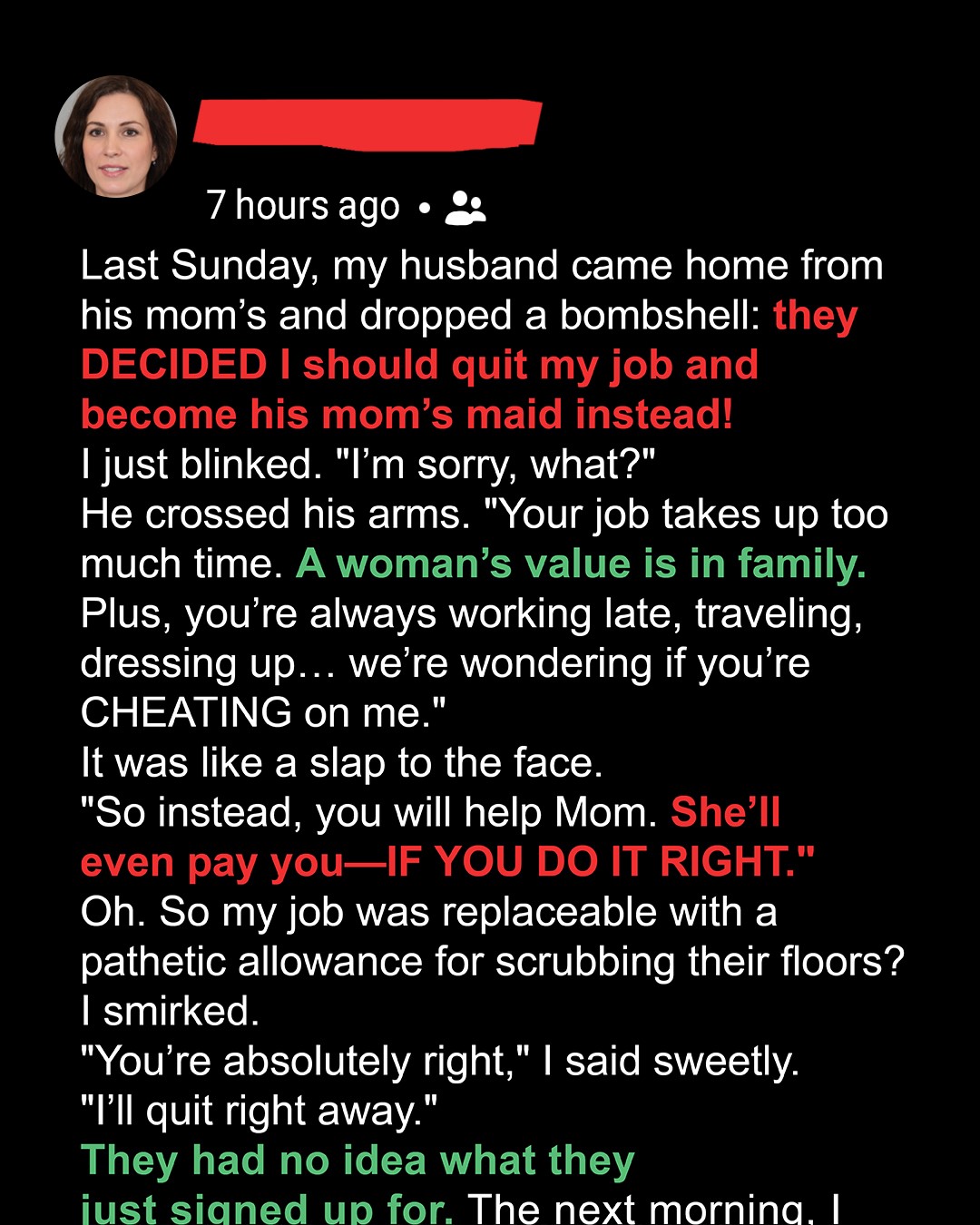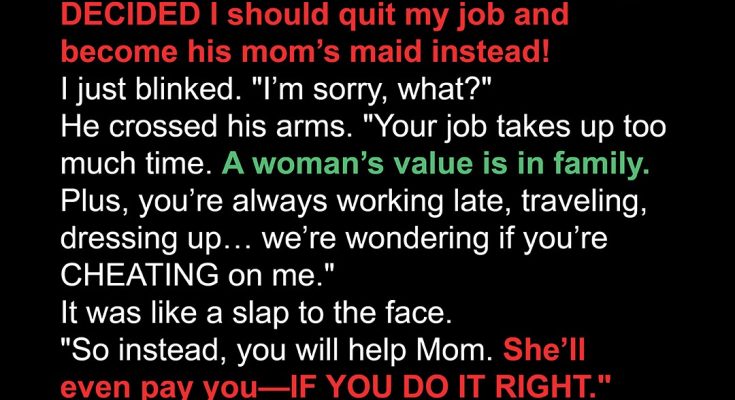 Last Sunday, my husband came home from his mom’s and dropped a bombshell. He walked in, took off his shoes, and just stood there in the living room, hands shoved in his pockets, looking strangely uncomfortable. I asked him if everything was okay. He just stared at the floor.Then he blurted it out.“Mom and I decided you should quit your job and become her maid instead.”