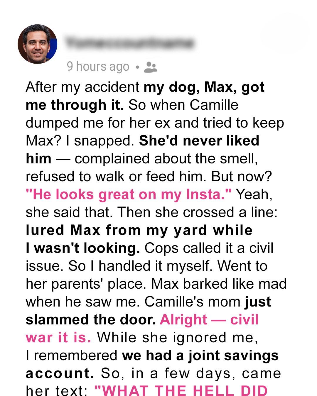 The world went black for a long time after the accident. When I finally came back, bruised and broken, the only thing that felt real was Max. My dog. He never left my side through the endless physio, the phantom pains, the overwhelming grief. His soft fur, his warm presence, he was my anchor. He was the reason I started breathing again, the only thing that made sense when everything else shattered.Then Camille came along. She was beautiful, sharp, a whirlwind I needed. But she never really got Max. “He sheds too much,” she’d say, wrinkling her nose. “Can’t you do something about the dog smell?” She refused to walk him, refused to feed him. I just figured she’d come around. I made excuses for her, told myself she didn’t understand our bond. That Max had literally saved me.