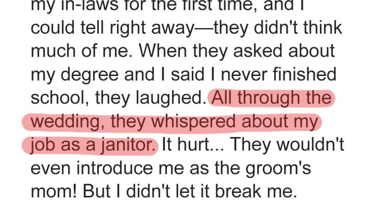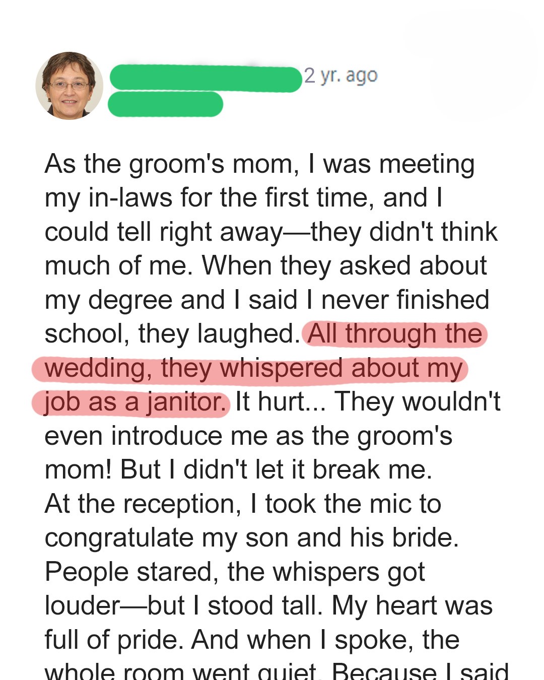All through the wedding, it was worse. A constant, low hum of whispers followed me. “Did you hear? The groom’s mother is a… janitor.” The word felt like a brand. Every time I turned, I’d catch them glancing, covering their mouths, then looking away with disdain. They introduced everyone – cousins, distant aunts, even the dog groomer – but when it came to me? Nothing. I stood by the aisle, an invisible woman, watching my son marry into a family that clearly thought I was beneath them. They wouldn’t even introduce me as the groom’s mom! It felt like a deliberate erasure.