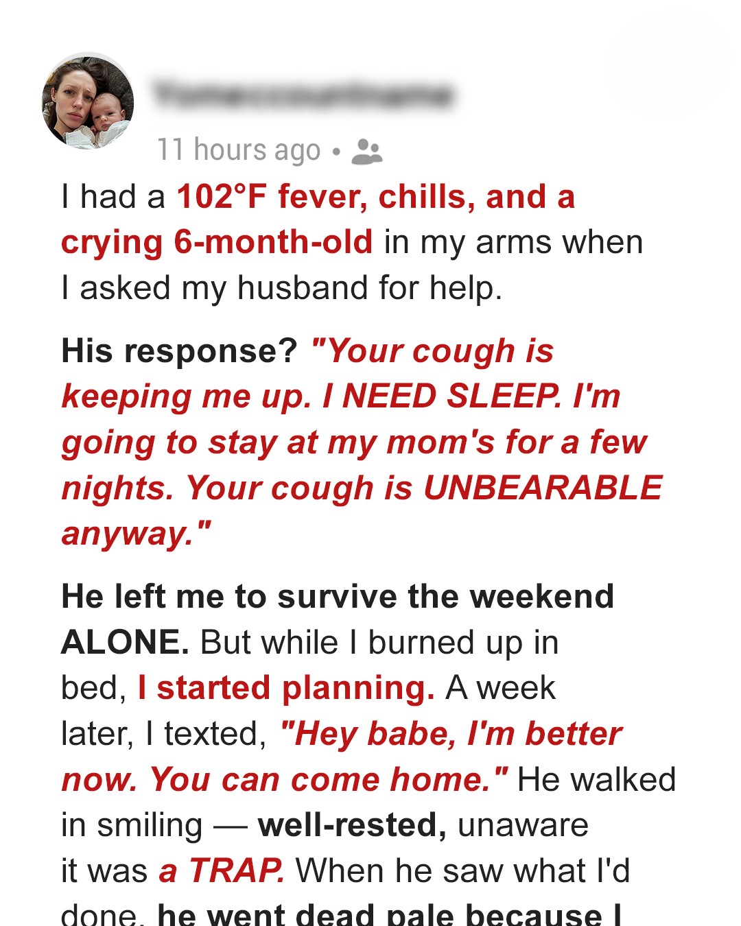 I had a 102°F fever, chills racking my body so violently the bed shook. My head throbbed, every cough an explosion in my chest. And in my arms, my beautiful, tiny 6-month-old, wide awake and inconsolable, crying for comfort I barely had the strength to give. Just a little help, I thought, my voice raspy. I turned to him, pleading. His eyes, already narrowed with annoyance, hardened. “Your cough is keeping me up. NEED SLEEP.” He didn’t even look at our baby. He just stared at the ceiling, as if my very existence was an inconvenience. “I’m going to stay at my mom’s for a few nights. Your cough is UNBEARABLE anyway.”