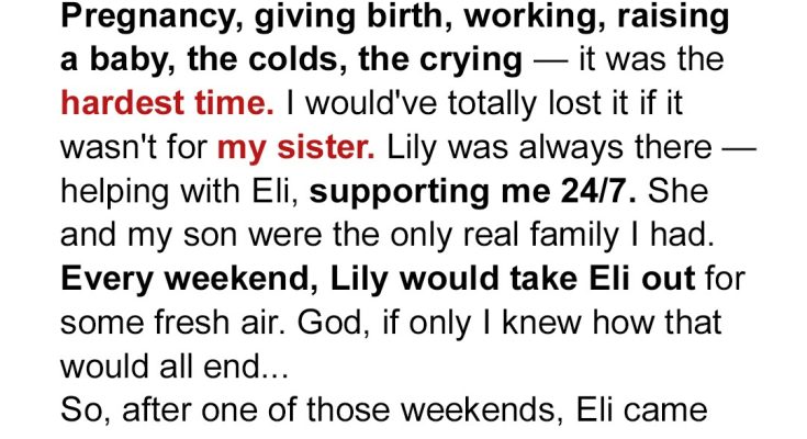 I’m a single mom, and my son is 5. His dad ditched me before Eli was even born. Pregnancy, giving birth, working, raising a baby, the colds, the crying — it was the hardest time. I would’ve totally lost it if it wasn’t for my sister. Lily was always there — helping with Eli, supporting me 24/7. She and my son were the only real family I had. Every weekend, Lily would take Eli out for some fresh air. God, if only I knew how that would all end… She was my anchor. I was drowning in exhaustion and loneliness until Lily walked through my door. She didn’t just help; she saved me. She’d scoop Eli up, let me sleep for an hour. She cooked, cleaned, whispered words of encouragement when I felt like I couldn’t breathe.