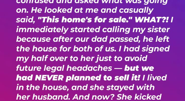 Our dad had passed almost a year ago. A lifetime ago, it felt like. He’d left the house to both of us. But to avoid future legal headaches, just to keep things simple, I had signed my half over to her. We had never planned to sell it. She lived with her husband across town. This was my life, my sanctuary. She knew that. We had explicitly agreed.