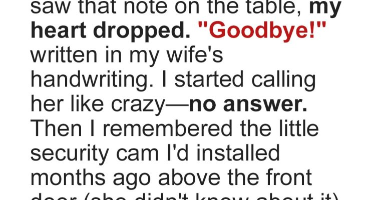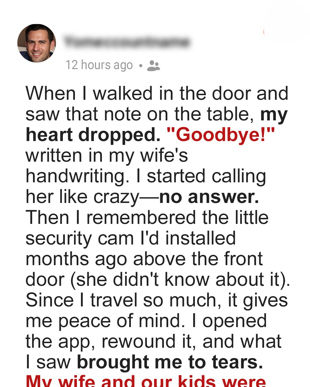 When I walked in the door and saw that note on the table, my heart dropped. “Goodbye!” written in my wife’s handwriting. I started calling her like crazy—no answer. Then I remembered the little security cam I’d installed months ago above the front door (she didn’t know about it). Since I travel so much, it gives me peace of mind. I opened the app, rewound it, and what I saw brought me to tears. My wife and our kids were… … standing by the door, suitcases lined up. My heart hammered against my ribs. This can’t be happening. I scrolled further back, desperately. She’d been packing all afternoon. Fast. Frantic. Her movements were sharp, her face a mask of grim determination. My little boy, usually a ball of boundless energy, clung to her leg, eerily quiet. My daughter, older, watched her mother with wide, scared eyes. This wasn’t an argument. This was an escape.