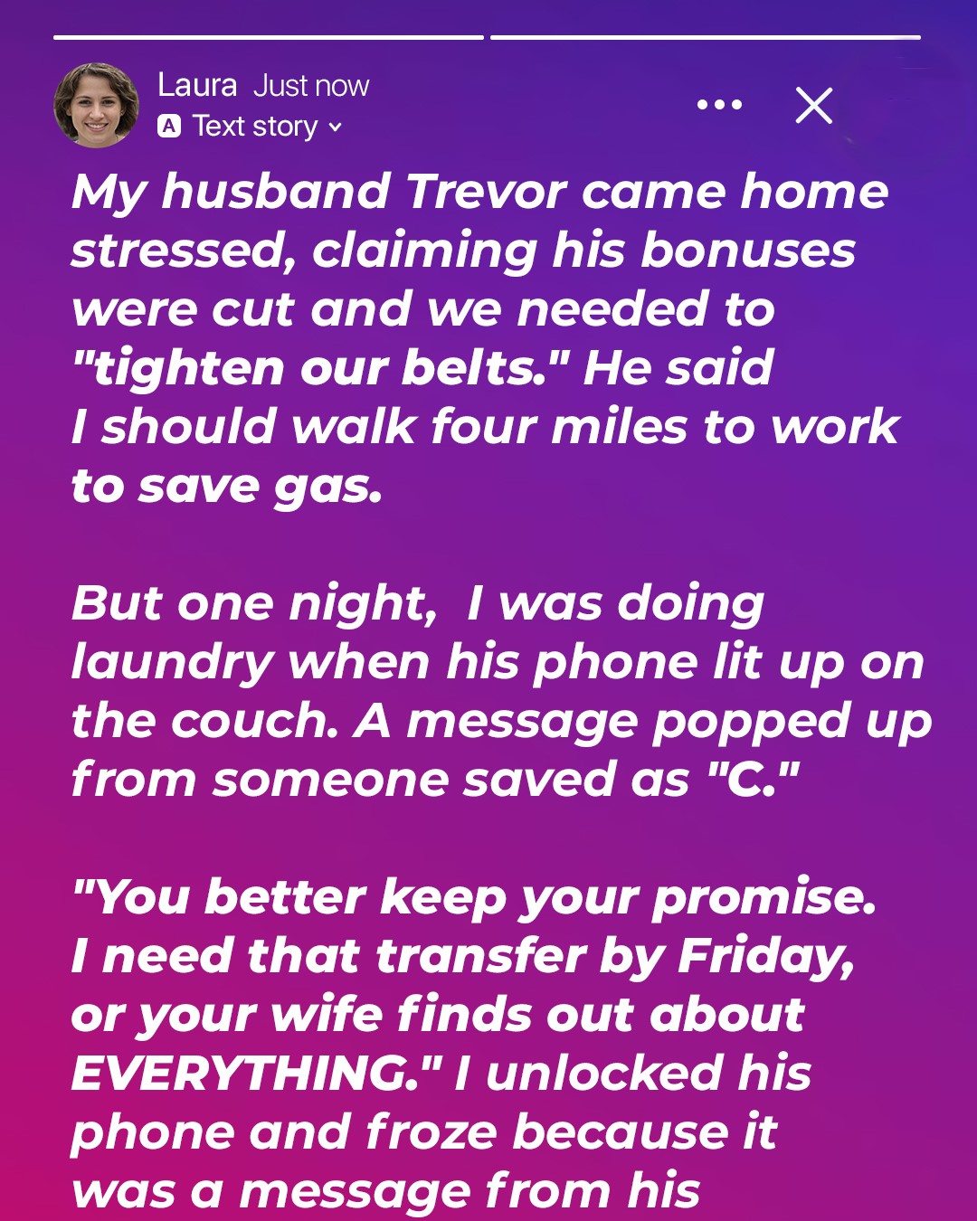 My husband Trevor came home stressed, claiming his bonuses were cut and we needed to “tighten our belts.” He said I should walk four miles to work to save gas. Four miles. My feet already ached from standing all day. A wave of resentment washed over me, but I swallowed it. He’s stressed, I told myself. We’ll get through this. For weeks, it was little cuts, little sacrifices. My lunch budget, my coffee run, gas for my car. Every penny counted, he said. But one night, I was doing laundry when his phone lit up on the couch. A message popped up from someone saved as “C.”
