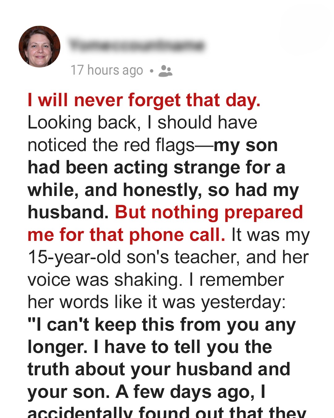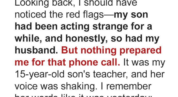 I will never forget that day. Looking back, I should have noticed the red flags—my son had been acting strange for a while, and honestly, so had my husband. Oh, the things we tell ourselves to avoid the truth. My husband had become distant, always glued to his phone, whispering into it in the garage. He’d say he was “closing a big deal,” working late, but his eyes were always shifty. My son, my sweet, open-hearted boy, turned inward. He stopped making eye contact. He flinched when anyone raised their voice, even playfully. He started losing weight. I asked, of course I did. He’d shrug, say “just tired,” or “homework,” and my husband would always chime in, “Teenage angst, honey. He’ll grow out of it.” And I believed them. I wanted to believe them. But nothing prepared me for that phone call. My phone buzzed on the kitchen counter, and I saw it was my 15-year-old son’s teacher. Odd. My heart gave a little lurch. She never called during school hours unless it was important. I answered, trying to sound normal. “Hello?”