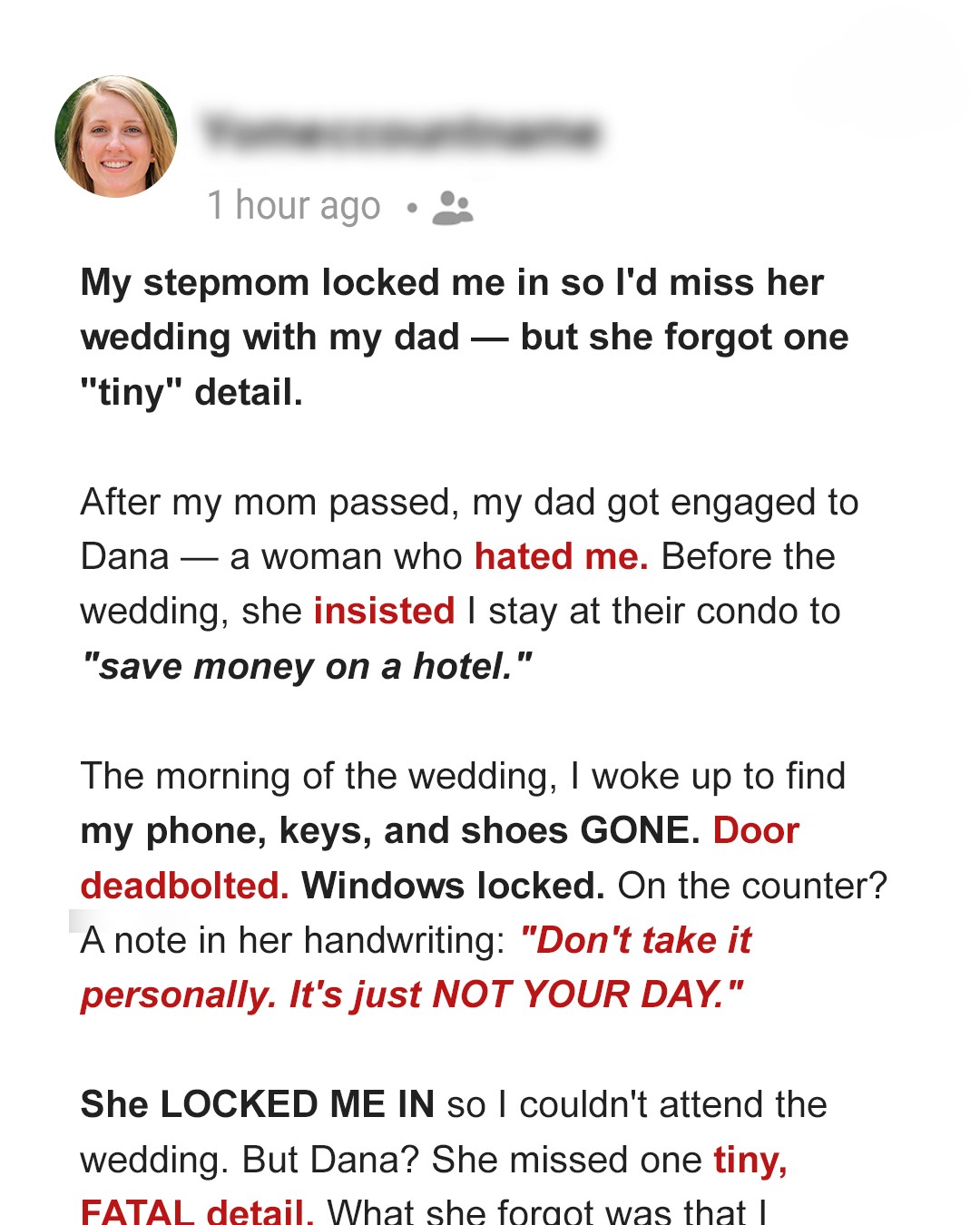My mom passed so suddenly. One day she was there, full of life, the next, gone. The world felt empty. Then, less than a year later, my dad met her. Dana. She was beautiful, sharp, and from the moment we met, I could feel it: she hated me. Every look was a judgment, every word a thinly veiled jab. But my dad was happy, or so he said. And he was getting married. To her. The wedding was planned for a fancy resort, hours away. “Don’t bother with a hotel,” she chirped, saccharine sweet. “You can stay at our condo. We’ll be at the resort with everyone else, but you’ll have the place to yourself, save some money.” It sounded too good to be true, and yet, a part of me, desperate for any shred of normal, agreed. I packed a small bag, drove up, and settled into the guest room of what she proudly called “their” place. It was minimalist, modern. Not like my mom’s warm, cluttered home.