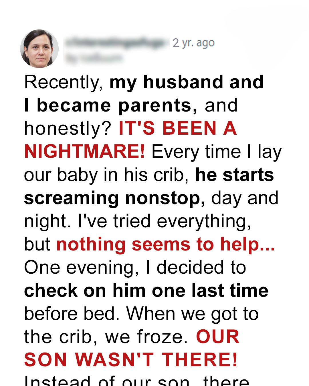 Recently, my husband and I became parents, and honestly? IT’S BEEN A NIGHTMARE! Every time I lay our baby in his crib, he starts screaming nonstop, day and night. Not a whimper, not a fuss, but an ear-splitting, blood-curdling shriek that rips through my soul. Two months. Two months of this. I’m a ghost of myself, running on fumes and the bitter taste of utter failure. We tried everything. Doctors, pediatricians, specialists. Countless formula changes, reflux meds, colic drops, weighted swaddles, white noise machines. We even hired a sleep consultant who just stared at us, bewildered, as our baby turned beet red, pushing himself against the bars, screaming until he choked. They all said he was healthy. They all said it was normal. But this wasn’t normal. This was torture. Our perfect little nursery, painted with so much love, became a chamber of dread. My husband was… supportive. He’d hold me as I cried, assure me I wasn’t a bad mother, tell me we’d get through this. But then, after I’d collapsed in exhaustion, unable to stand the sound another second, he’d always be the one to finally get the baby to calm down. He’d walk out of the nursery an hour later, looking tired but victorious. “He’s finally asleep,” he’d whisper, and I’d fall into a shallow, guilt-ridden slumber, only for the screaming to start again a few hours later, always from the crib. It was always the crib.