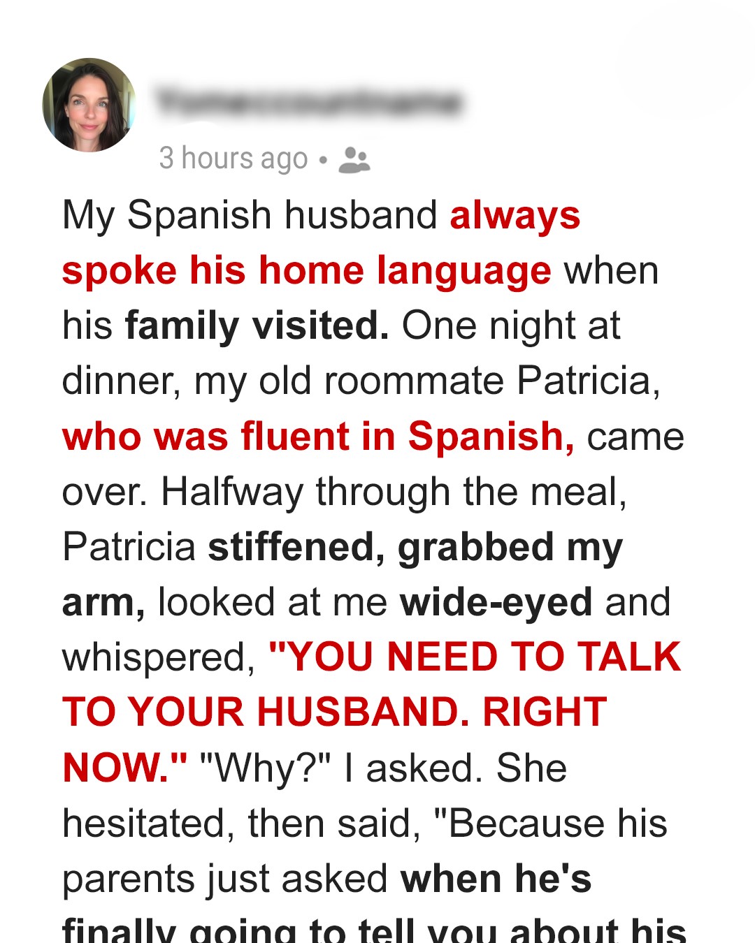 He always spoke his home language when his family visited. It was one of those things I’d come to accept, even cherish, as part of our beautiful, complicated life together. I’d sit at the table, smiling, nodding, picking up a stray word here and there – mi amor, familia, gracias. I never felt left out, not really. It was their time, their bond, and I was just happy to be there, part of it all. Or so I thought. Then Patricia came over for dinner. My old roommate, fluent in Spanish from a year abroad, a master’s in linguistics, the works. I was excited for her to finally meet everyone. The evening started like any other family gathering. Lively. Loud. The clinking of glasses, the rich aroma of his mother’s cooking. My husband’s voice, a warm rumble as he laughed with his uncle. I was telling Patricia a story about our wedding, and she was listening intently, smiling, nodding, just like I usually did when everyone else was speaking Spanish.